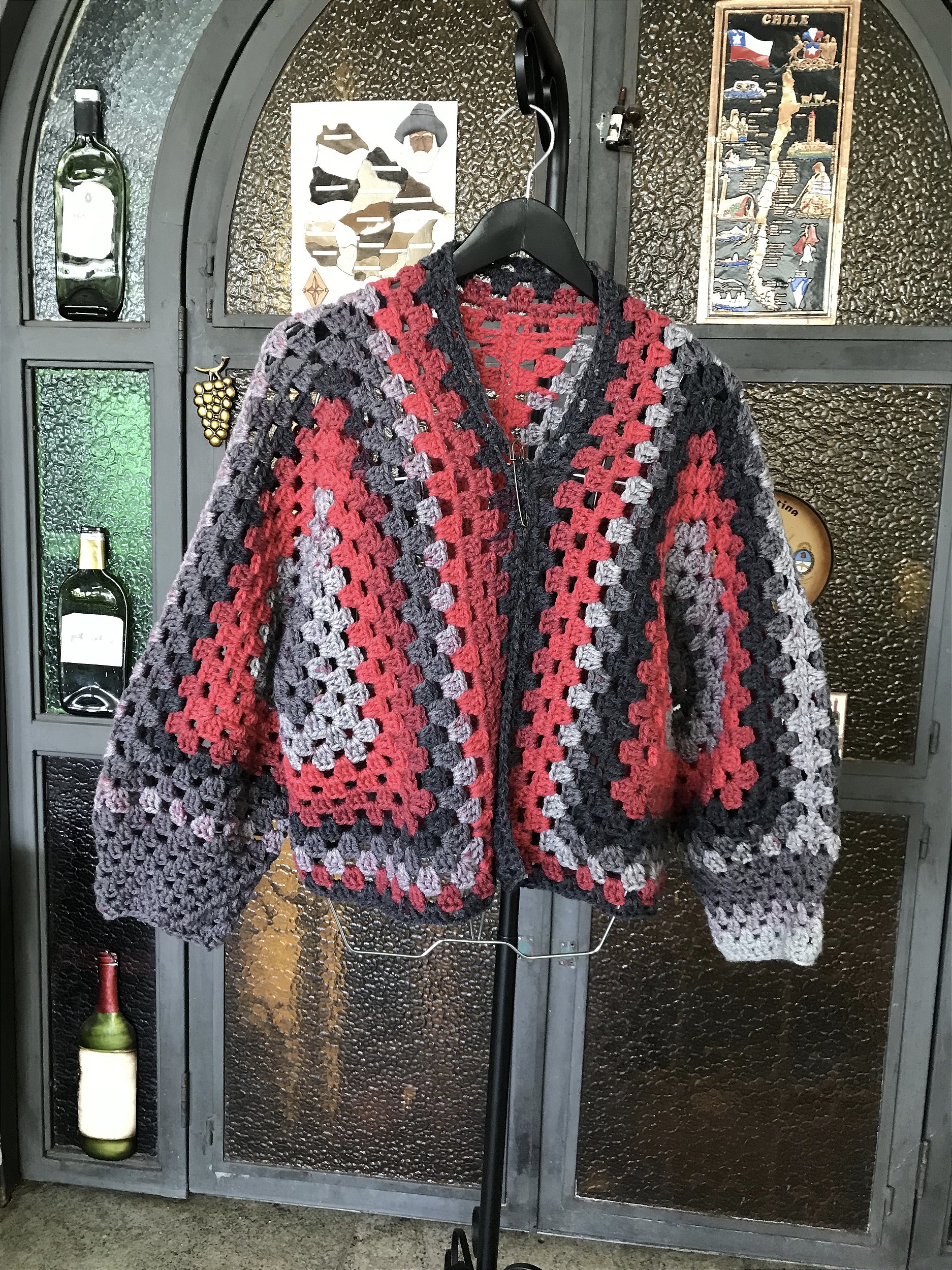 Casaco de crochê feito com fio 100% acrílico.